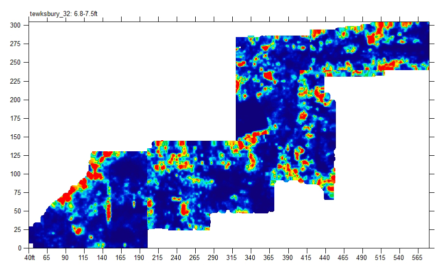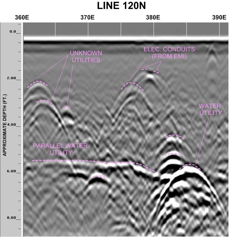 GPR data was collected using GSSI's SIR-3000 and a 400 MHZ antenna that identified a number of features, within the survey area, to a maximum depth of 9 ft. (view animation below). Data was collected in a grid laid out in the survey area with lines spaced at every 2' x 5'. The collected data was then assembled in to a 3D grid using GSSI's Radan 6 for interpretation. The image below shows not only the clarity of the data, but also the many utilities located in the scan area.